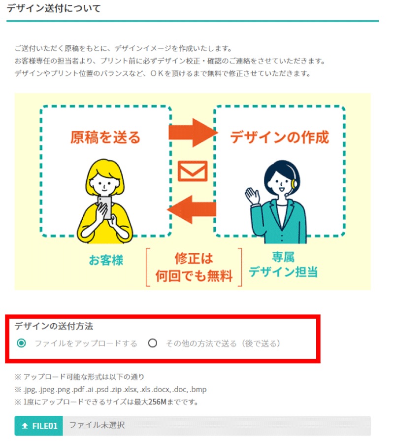 ダウンロードした生成画像を原稿として、アップロードしてください。修正が必要な場合は、「その他ご要望」欄に修正内容をご記入ください。