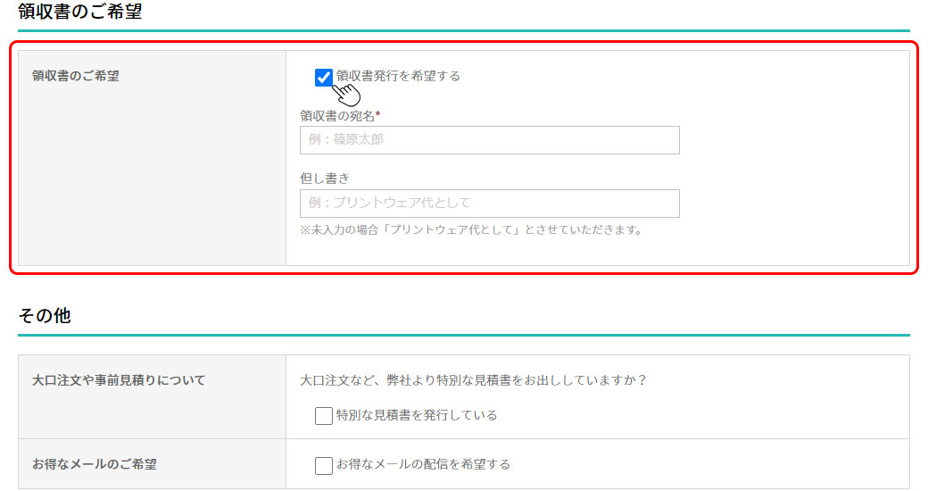 領収書をご希望される場合は、ご注文の際に、お客様情報の入力画面の「領収書発行を希望する」にチェックを入れてください。