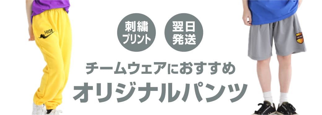 オリジナルパンツを激安でプリント・作製ならCLAT-JAPANへ! ハーフからロングまで長さいろいろ。シャツやトレーナーと上下セットでオリジナルウェアを揃えることができます!スウェット系のパンツはダンスチームの衣装、ドライ系のパンツは部活動の練習着として人気のアイテムです。