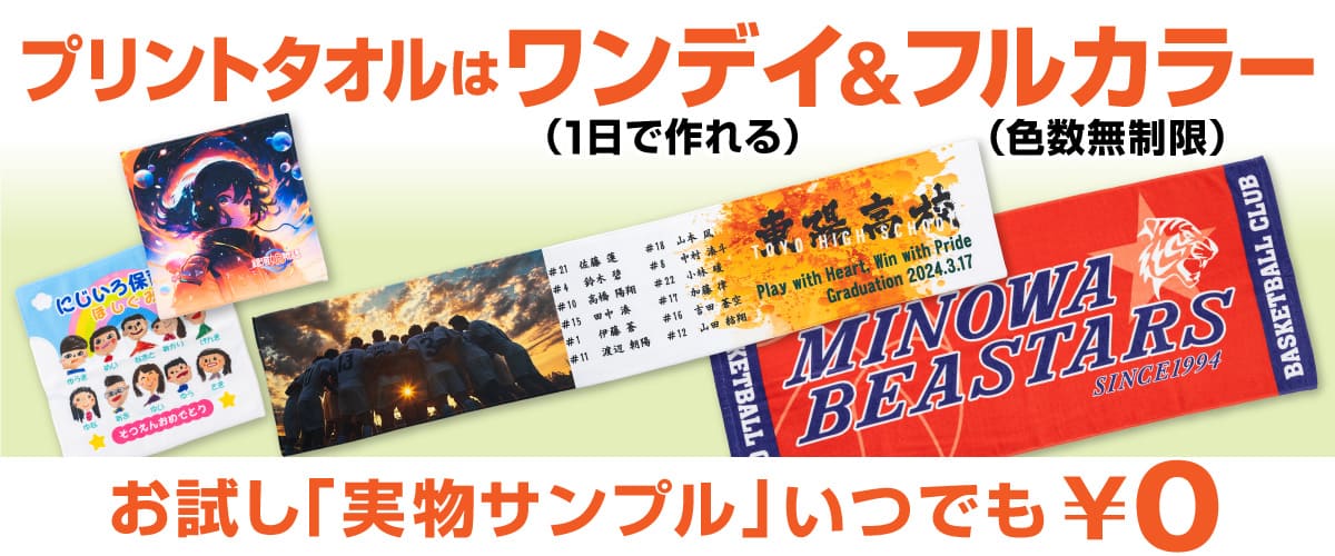 ポリエステル素材でタオルの機能性よりも、オリジナルデザインをくっきりとインパクトあるプリントに仕上げることができます。販売品タオル・記念品タオルに最適なタオルシリーズです。