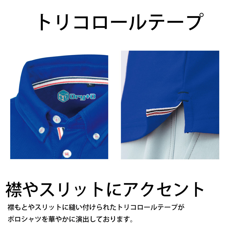 50391 | SOWAいつまでも続くドライ感とハニカムメッシュの柔らかな着心地のダブル機能でいつも爽やかに着られる、オシャレなボタンダウンポロシャツのご紹介です!最大の特徴は、襟の内側とスリット裏にトリコロールラインが入っているので、ボタンを一つ外す事により中のラインが顔を出し『おっ!!』と思われるオススメのアイテムです!