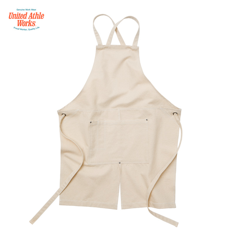 1384 | United Athleフロントスリットを配置することにより引っかかりを軽減。しゃがみやすいため、キッチンからガーデニングと幅広いワークウェアとしても利用可能。ペン差し付きの大振りのポケット付きのため実用性も抜群。また、マットシルバーのリベットやアイレットのギミックが頑丈さとオーセンティックさを表現しています。