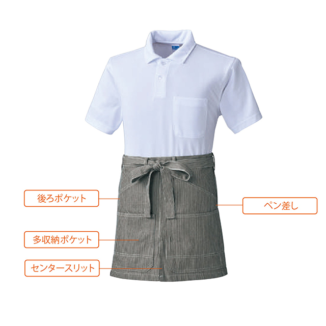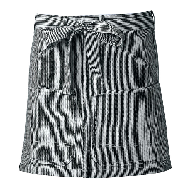 10120 | SOWA厚手のストライプ生地を使用したおしゃれなショートエプロンです。綿100%素材で耐久性に優れていて、飲食店だけではなくDIYや園芸用など用途を問わずに使えます。センタースリットが入っているので、動きにくさを軽減できるようになっています。また、ペン差しや多収納のポケットが付いているので、収納力、実用性ともにバツグンです。