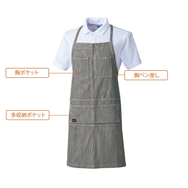 10121 | SOWA厚手のストライプ生地を使用したおしゃれな首掛けエプロンです。綿100%素材で耐久性に優れていて、飲食店だけではなくDIYや園芸用など用途を問わずに使えます。センタースリットが入っているので、エプロンならではの動きにくさを軽減できるようになっています。また、ペン差しや多収納のポケットが付いているので、収納力、実用性ともにバツグンです。
