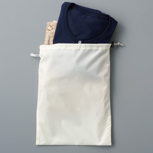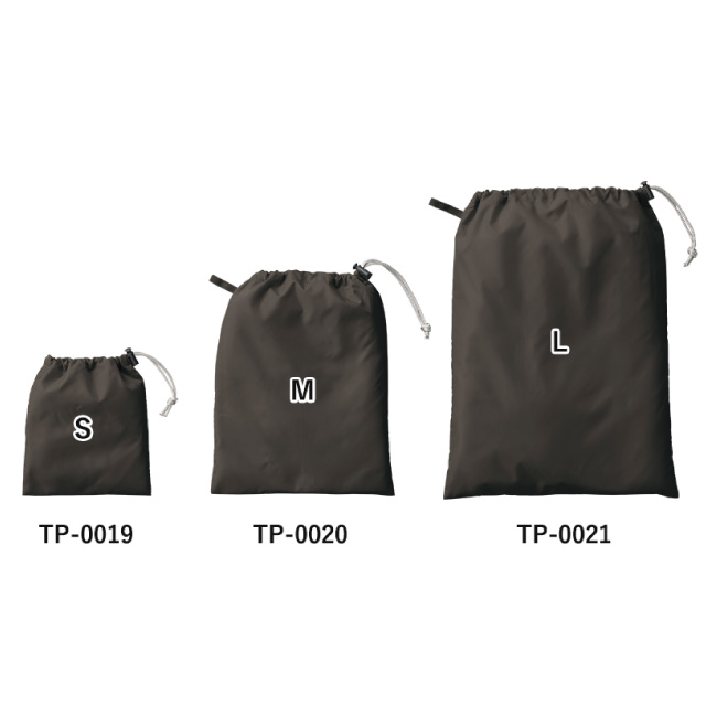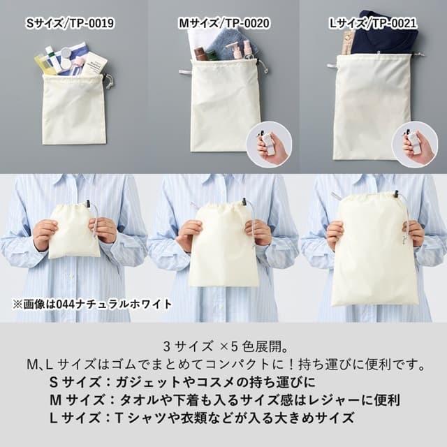 TP-0021 | MARKLESS STYLEカジュアルな雰囲気のおしゃれな巾着ポーチ。しなやかでさらっとした手触りが特徴の、ポリエステル生地を使用しています。薄手のポリエステル素材と、アウトドアをイメージさせるようなストッパーやひもは相性抜群! サイドのゴムでコンパクトにまとめることができるので、レジャーにも便利です。S・M・Lの3サイズ展開で、LサイズはTシャツなどの衣類を入れることができるため、仕分け用としても役立ちます。アウトドアブランドのノベルティやグッズとしてもおすすめです。