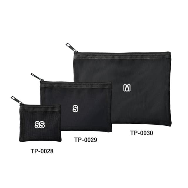 TP-0030 | MARKLESS STYLEフラットタイプですっきりと使えるメッシュポーチ。表面がメッシュ仕様のため簡単に中身を確認でき、旅行やレジャー用としてもぴったり!素材にハリがあり、中身がつぶれにくいのもポイントです。SS・S・Mの3サイズ展開で、Lサイズは大きめなので文具や小さな本を入れたり、小さめタオルや洗面用具を入れるなど、多目的にお使いいただけます。裏面にデザインを入れて頂くことが可能です。