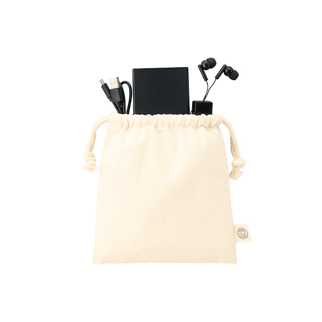 TR-1283 | MARKLESS STYLEオーガニックコットン素材を使用したマチなしのすっきりとしたデザインの巾着Sサイズです。Sサイズは充電ケーブルやモバイルバッテリーなどのガジェット類や目薬、リップなどを入れるのにちょうど良いサイズ感です。ショップの購入特典やイベントのノベルティグッズなどにもおすすめです。