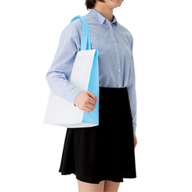 TR-0668 | MARKLESS STYLE2トーンのコンビカラーが目を引く、大容量トートバックです。こちらの素材は比較的低価格で、かつ環境に優しい今注目のアイテムです。丈夫で繰り返し使える事から、ノベルティ商品をお探しの方にもおすすめです。大きなものも楽々入り、肩から掛けられるバックなのでクリーニング店のお持ち帰り袋や、学校関係の資料バックとしてもお使い頂けます。可愛いデザインと、軽くて折りたためる扱いやすさからとても喜ばれる商品です。