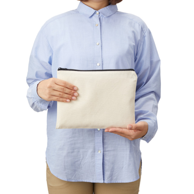 TR-0895 | MARKLESS STYLE人気のキャンバスフラットポーチのLサイズ!およそB5サイズの大きさですがお値段はリーズナブルなので、ノベルティなど大量発注にもってこいの商品です。黒色でかっこよく、ピンクで可愛らしく、伝えたいイメージをプリントするのもおすすめです。Lサイズのほかに、S・Mもご用意しております。