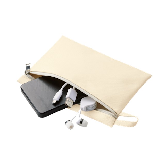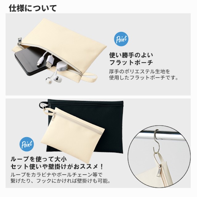 TR-1061 | MARKLESS STYLEバッグの中でかさばりにくく、すっきり収まるマチのないフラットタイプのポーチSサイズです。耐久性に優れた厚手のポリエステル生地を使用しているので丈夫な質感です。充電ケーブルやモバイルバッテリーなどのガジェット類や目薬、リップなどを入れるのにちょうど良いサイズ感です。ショップの購入特典やイベントのノベルティグッズなどにもおすすめです。