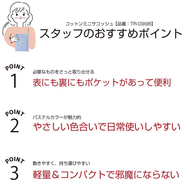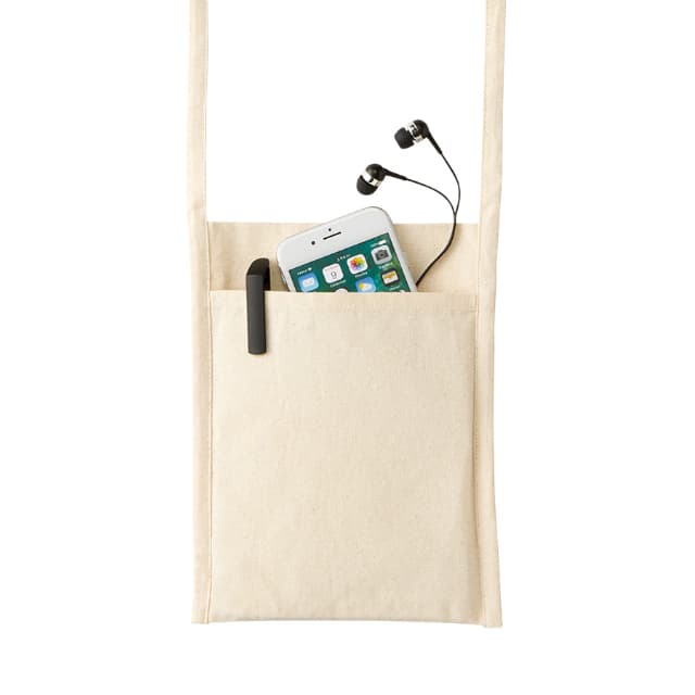 TR-0998 | MARKLESS STYLEコットン素材で柔らかく落ち着いた雰囲気のあるサコッシュが登場です。両面ポケット付で機能性抜群!表面のオープンポケット、裏面のかぶせポケットと、2つのポケットの付いた使い勝手のよさが魅力です。表面のオープンポケットはメモ帳やスマホ、ペンなどをサッと出し入れ簡単!裏面のかぶせポケットは鍵や財布などの貴重品入れに安心してお使いいただけます。楽々斜め掛けにできる紐の長さです。学校行事や会社の説明会、会議などでも活躍してくれそうです。手軽でシンプルなのでさまざまなシーンでお使いいただけます。