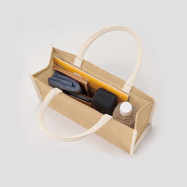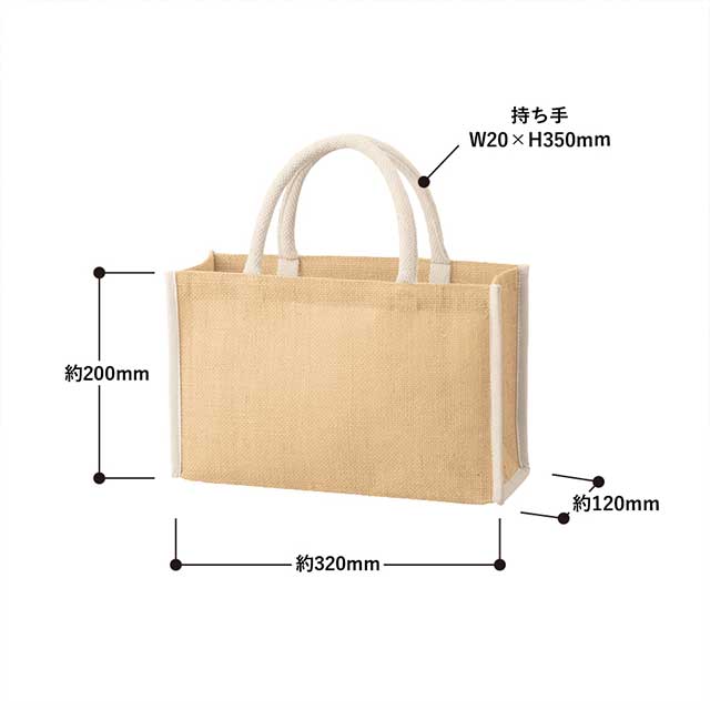 TR-1289 | MARKLESS STYLEパイピング&ハンドル部分を配色にしたデザインのジュート素材バッグです。 通常のスクエアトートのデザインが少し物足りないという方にぴったりです。 見た目はコンパクトですが、500mlのペットボトルを縦にピッタリ入れる事ができ、しっかりと荷物の収納が可能です。 ランチタイムやちょっとしたお出かけにもピッタリのサイズ感です。 オーガニックコスメや食料品店などのパッケージとしてもおすすめです。