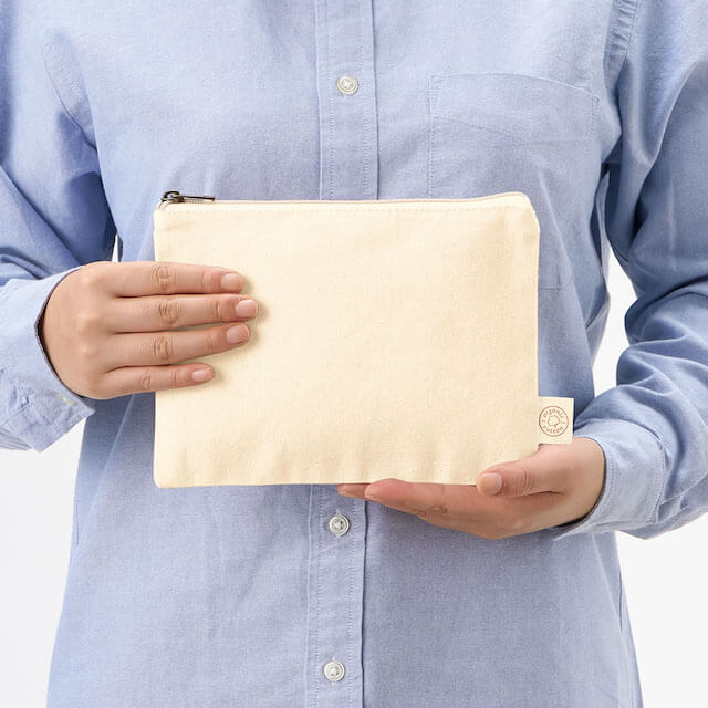 TR-1308オーガニックコットンを使用したフラットポーチです。 バッグに収納しやすいフラットな形かつ、シンプルなデザインなので オリジナルロゴやキャラクターデザインなど名入れも映えます。 また引手部分にはアンティークゴールドを使用し、高級感のある印象にしました。 ご旅行時に小物入れとしても大活躍します。