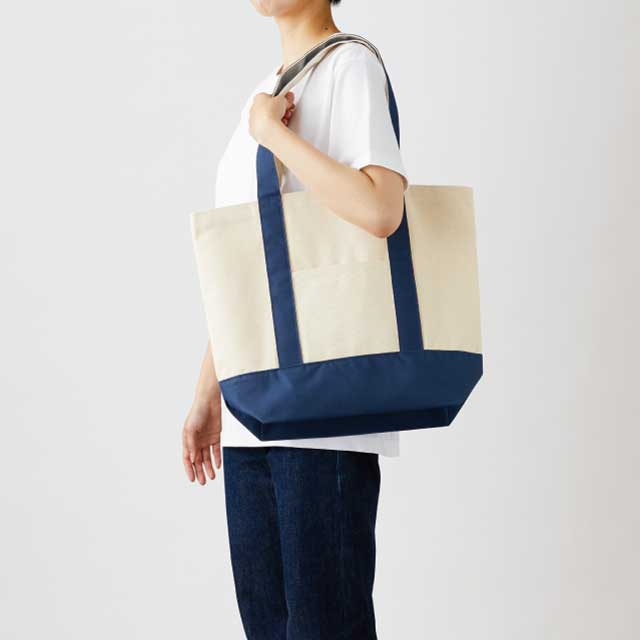 HVT-024 | TRUSS3色展開のバイカラートートバッグ。カラー部分はポリエステル100%素材で、水に強く丈夫です。16オンスで厚みがあり、しっかりしているのでアウトドア用品としての販売にもおすすめです。持ち手が肩から掛けられるので持ち運びにも便利です。バイカラーミニトートポケット付(MVT-026)とはカラー部分の素材と色味が異なります。