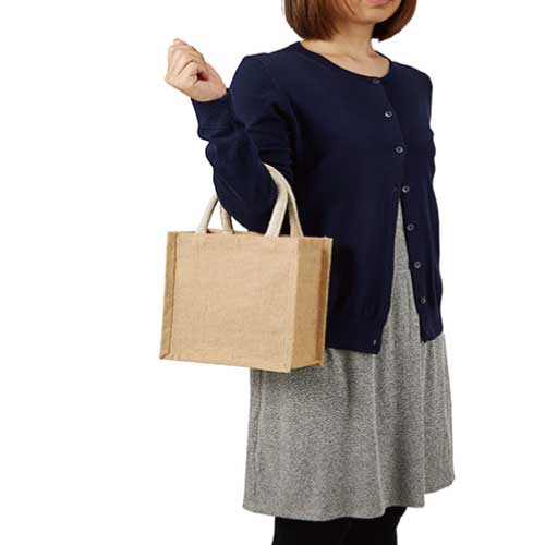 TR-1004 | MARKLESS STYLE人気のジュートバッグ。地球にやさしい天然素材を使用しているので、販促品としてはもちろん、オーガニックコスメや食料品店などのパッケージとしてもおすすめです。ランチタイムのお弁当などの持ち歩きや、ちょっとしたお出かけのバッグにぴったりなサイズです。ざっくりしたナチュラルな素材感は、バッグとしてだけでなく、インテリアとして飾ってもおしゃれです。