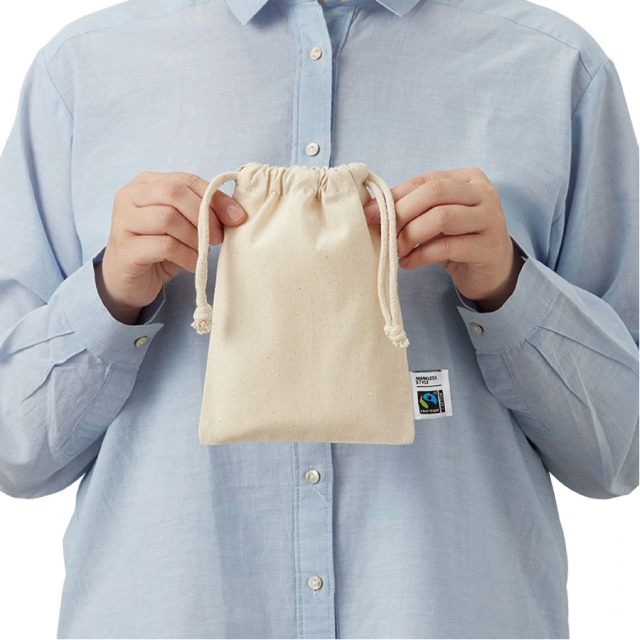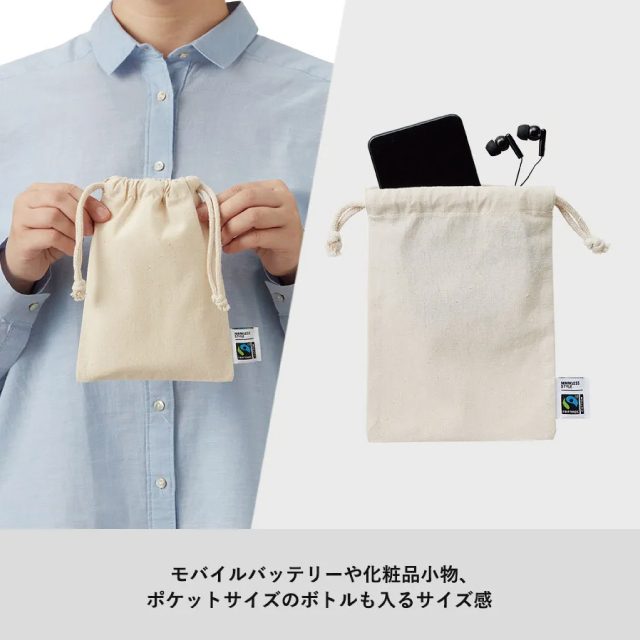 TF-0005 | MARKLESS STYLE生地、紐、全ての素材にフェアトレード認証のオーガニックコットンを使用した巾着です。モバイルバッテリーや小物が入る程良いサイズ感で、日常使いにピッタリです。オーガニックコットン特有のナチュラルカラーが、お客様のプリントしたいデザインを際立たせます。また、国際フェアトレード認証ラベルが付いているので、企業様のSDGs関連の活動や、イメージアップにもご活用いただけるのも嬉しいですね。