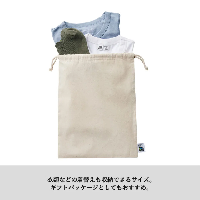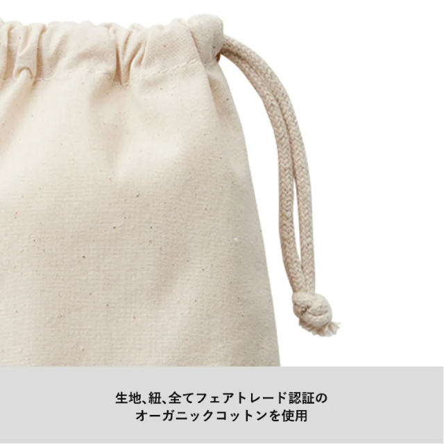 TF-0007 | MARKLESS STYLE生地、紐、全ての素材に、フェアトレード認証のオーガニックコットンを使用した巾着です。Tシャツやフェイスタオルなど、ちょっとしたお出かけや旅行に持ち運ぶのにピッタリです。普段の生活にも馴染む優しいナチュラルなカラーなので、使用用途も限定されず、使いやすいのが魅力的です。また、国際フェアトレード認証ラベルが付いているので、企業様のSDGs関連の活動やイメージアップにもご活用いただける商品です。