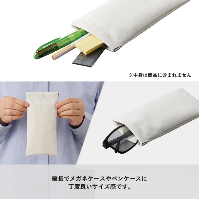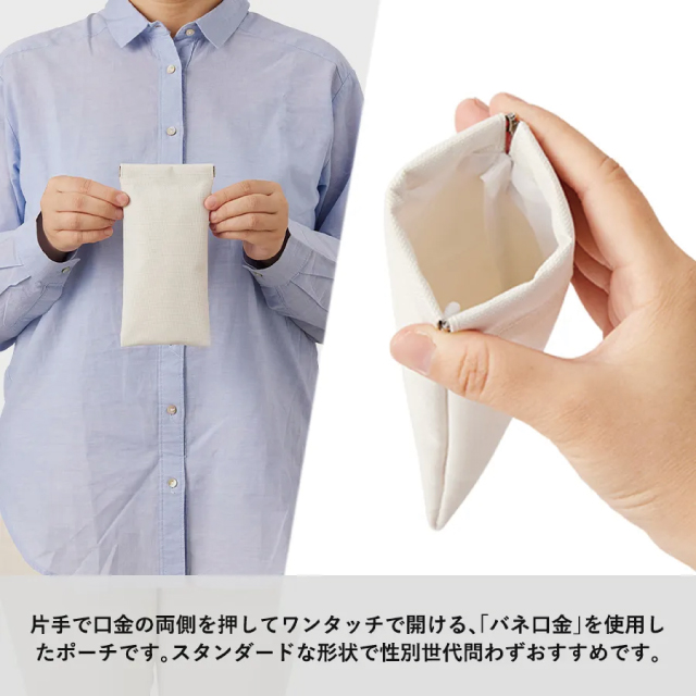 TR-1165 | MARKLESS STYLE片手でパカっと開きやすい「バネ口」タイプのロングポーチです。ポーチ特有のチャックや紐がないから、使いたい時にすぐに取り出せるのがポイント。メガネケースやペンポーチを入れるのにピッタリのサイズ感となっています。カラー展開もナチュラルカラーだから、使用シーンが限定されないのもいいですね。便利さを追及したこの商品を使ったら、他のものが使えなくなってしまうかもしれません。
