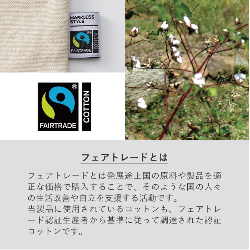 TF-0001 | MARKLESS STYLE生地、紐、全ての素材にフェアトレード認証のオーガニックコットンを使用したバッグです。A4サイズが入るフラットトートとなっており、デイリー使用にピッタリのサイズ感です。ナチュラルな風合いが魅力的で、持ち手部分が二つ折り縫製のため、手で持ったり、肩掛けした際にも負担がかかりにくいのが嬉しいですね。商品カラーは、どんなスタイリングにも合うナチュラルカラーをご用意。SDGs活動に関連した企業様のイメージアップにも貢献いただける、おすすめの商品です。