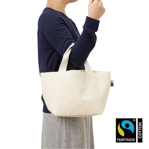 TF-0003 | MARKLESS STYLE生地、紐、全ての素材にフェアトレード認証のオーガニックコットンを使用したバッグです。サイズ感は、お弁当入れやちょっとしたお出かけにピッタリのランチトートサイズです。持ち手が二つ折り縫製のため、手に馴染み持ち運びもストレスフリーなのが嬉しいポイント。カラーは、スタイリングに迷わないベーシックなナチュラルカラーをご用意。どんな場面でもあなたのスタイルにマッチしてくれます。また、国際フェアトレード認証コットンラベルも付いているので、企業様のSDGs活動を通したイメージアップに活躍してくれることでしょう。