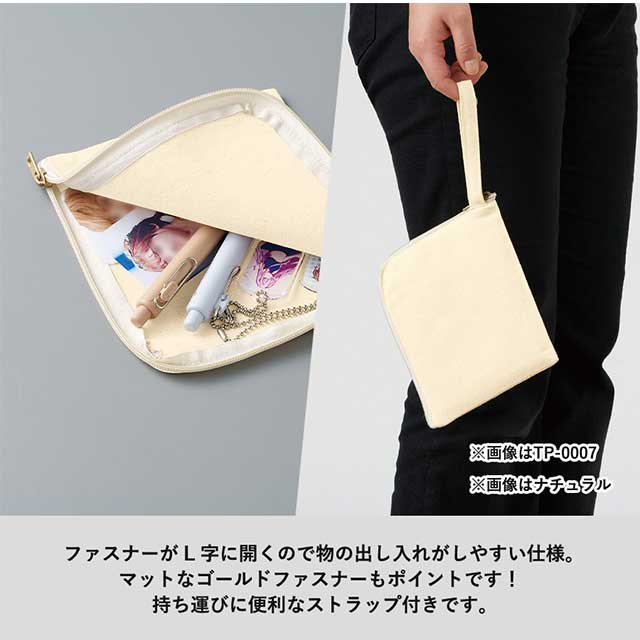 TP-0007 | MARKLESS STYLEしっかりとしたキャンバス生地のL字ファスナーポーチです。 ファスナーはL字に開くため物の出し入れがしやすく、ストラップ付なので持ち運びにも便利です。 実用性も高く、豊富なカラーバリエーションで展開しているため、 流行の推し活グッズとしてのご提案もおすすめです。 Sサイズはアクリルグッズなど持ち運び用の小物入れとしてぴったりです。