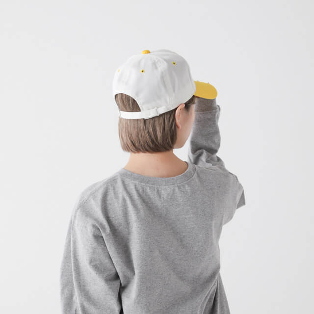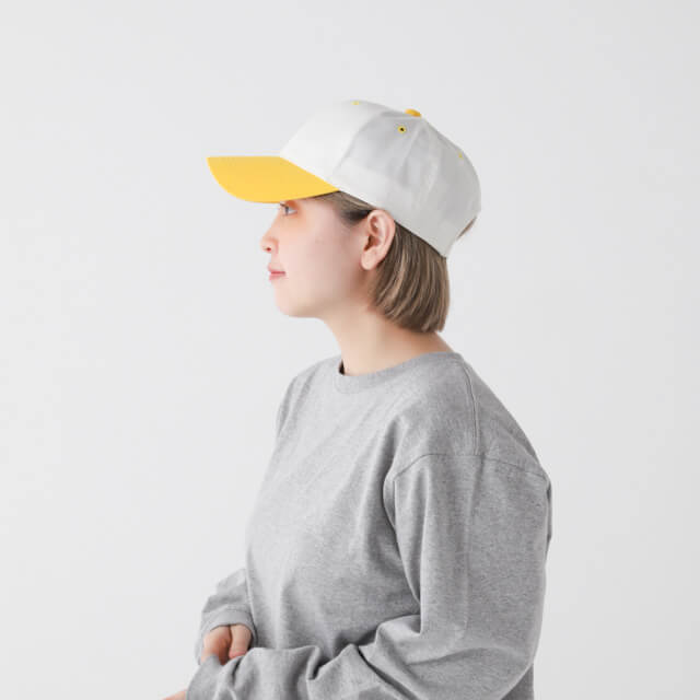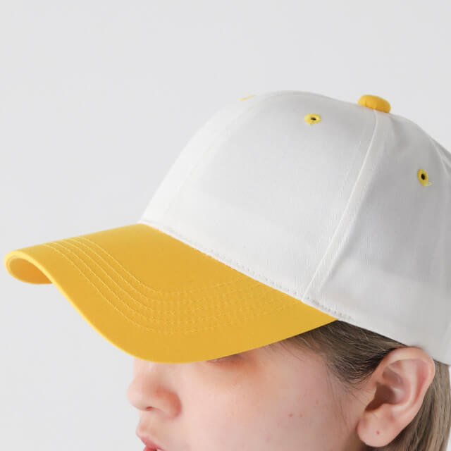TN | POINTSKYWARDかわいらしいカラフルなつばが特徴の、レトロな雰囲気のキャップ。本体のアイレット(穴)のかがり縫い部分や、頭頂部のボタンがつばと同じカラーでシンプルながらも目を惹きます。丈夫な混紡生地を使用しており、軽い被り心地。シンプルに同カラーで刺しゅうやプリントを入れても素敵です。